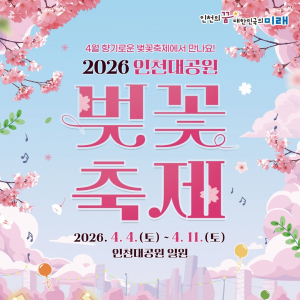 인천광역시는 4월 4일부터 11일까지 인천대공원에서 ‘2026 인천대공원 벚꽃축제’를 개최한다. 행사 기간을 8일로 확대해 지역 예술인 공연과 AI 포토 스튜디오 등 다양한 체험 프로그램을 운영하며 시..