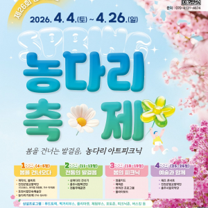 제26회 생거진천 농다리축제가 4월 4일부터 26일까지 진천 농다리 일원에서 개최된다. ‘아트피크닉’을 주제로 매주 주말 테마별 공연과 체험 프로그램이 운영되며, 국내 최장 미르309 출렁다리와 연계한 ..