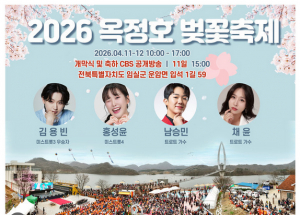 임실군이 4월 11일부터 12일까지 '2026 옥정호 벚꽃축제'를 개최한다. 김용빈, 남승민 등 스타급 트로트 가수의 개막 공연과 총상금 500만 원 규모의 '제2회 붕어섬 벚꽃가요제'가 옥정호 출렁다..