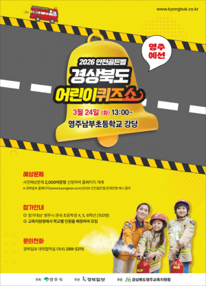 2026년 안전골든벨 경상북도 어린이퀴즈쇼 영주예선이 3월 24일 영주남부초등학교에서 열립니다. 영주시 초등 4~6학년 150명이 2천여 예상문제로 실력을 겨루며 안전 의식을 높이는 축제의 장이 될 예정..