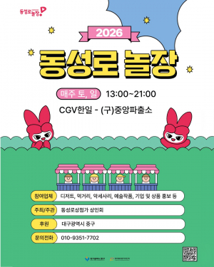 대구 동성로의 활기를 되찾기 위한 상설 플리마켓 동성로 놀장이 3월 재개장합니다. 매주 주말 먹거리와 예술작품 등 40여 개 부스가 운영되며, 단순 판매를 넘어 체험형 콘텐츠로 상권 공실을 줄이는 성과..