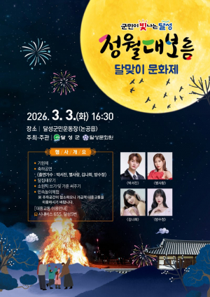 이번 문화제는 전통의 가치를 계승하며 달성군의 문화적 역량을 한데 모으는 계기가 될 것입니다. 활활 타오르는 달집처럼 달성군의 미래 가치 또한 밝게 타오르기를 기대합니다...