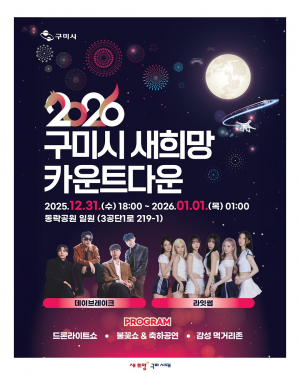 구미시는 2025년의 마지막 날과 2026년 새해를 잇는 ‘2026 구미시 새희망 카운트다운 행사’를 오는 12월 31일 오후 6시부터 2026년 1월 1일 오전 1시까지 동락공원 광장에서 개최한다. ..