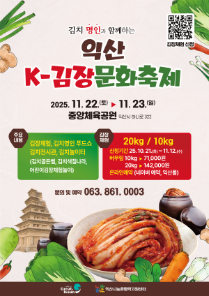 익산시가 김치 명인과 함께하는 'K-김장문화축제'를 올해도 개최한다. 이번 축제는 김치와 김장문화를 주제로 한 대표 체험형 행사로, 익산 지역 농산물을 활용한 건강한 김장 체험과 다양한 교육 콘텐츠가 ..