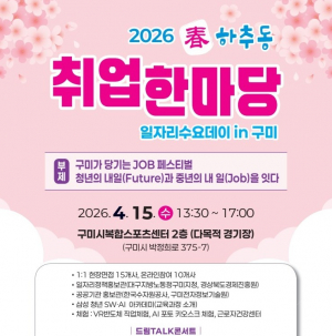 4월 15일 구미시복합스포츠센터에서 '2026 취업한마당'이 개최됩니다. 15개사 현장 면접과 반도체·방위산업 취업 특강, AI·VR 체험존 등 청년과 중장년을 위한 맞춤형 채용 프로그램이 운영됩니다...