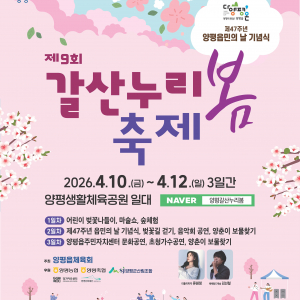 제9회 갈산누리봄축제가 4월 10일부터 3일간 양평생활체육공원에서 개최된다. 제47주년 양평읍민의 날 기념식과 벚꽃길 걷기, 음악회 등 다양한 민관 화합 프로그램이 운영되며, 갈산의 역사성과 남한강의 ..