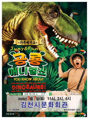 3월 7일 김천시문화회관에서 ‘쥬니&퍼니 공룡 애니멀쇼’가 개최됩니다. 화려한 레이저쇼와 실감 나는 공룡 퍼포먼스가 어우러진 이번 공연은 아이들에게 잊지 못할 상상력을 선물합니다. 온 가족이 함께 즐기..