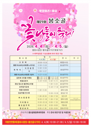 [통영=컬처GB신문] 경남 통영시 봉평동의 대표적인 봄 축제인 ‘제21회 봉숫골 꽃나들이 축제’가 오는 4월 4일부터 5일까지 양일간 용화사 광장과 봉숫골 벚꽃길 일원에서 개최된다. 봉숫골벚꽃축제위원회가 주최 및 주관하는 이번 축제는 ‘벚꽃야경 & 마실’을 부제로 설정하여 낮 시간대의 경관뿐만 아니라 야간 콘텐츠를 강화한 것이 특징이다. 축제 기간 용화사 광장에서 봉숫골 사거리에 이르는 구간은 차량 통행이 전면 통제되며 상춘객들을 위한 보행자 중심의 축제 공간으로 운영된다. 주요 프로그램으로는 첫날인 4일 축제의 안녕을 기원하는 ‘봉숫골 벚꽃 고유제’를 시작으로 제4회 통영 미스&미스터트롯 경연대회, 개막식, 벚꽃 프린지 공연이 주무대에서 펼쳐진다. 특히 통영 출신 축구선수인 김민재의 사인볼과 유니폼 추첨 이벤트가 진행되며, 이튿날인 5일에는 제4회 경남 청소년 춤꾼 페스티벌과 모두랑 가요제가 이어진다. 거리 곳곳에서는 길바닥 항칠아트존, 소망을 적는 벚꽃로망, 유등으로 장식된 벚꽃야경 마실길 등 참여형 콘텐츠가 상시 운영된다. 축제장 인근에는 한국의 피카소로 불리는 전혁림 화백의 작품을 전시한 전혁림미술관과 ‘꽃’의 시인 김춘수를 기리는 김춘수유품전시관이 자리 잡고 있어 축제와 연계한 문화 탐방이 가능하다. 또한 용화사 광장에는 캠핑 텐트를 활용한 가족 피크닉존이 설치되며 봉숫골 주막과 청년 포차존을 통해 지역 먹거리가 제공된다. 봉숫골벚꽃축제위원회는 이번 행사를 통해 지역의 자연 자산인 벚꽃을 매개로 주민 화합을 도모하고 침체된 지역 상권에 활력을 불어넣는 계기가 될 것으로 전망하고 있다.본지는 단순한 소식 전달을 넘어, 문화 현장의 기획 구조와 실무적 운영 방식을 세밀하게 기록함으로써 지역 문화 자산의 기초 자료를 보존하고 그 가치를 확산하는 데 목적을 둡니다.