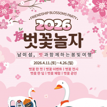 [춘천=컬처GB신문] 남이섬의 봄 경관을 배경으로 다양한 문화 콘텐츠를 선보이는 ‘2026 友(벗)꽃놀자’가 오는 4월 11일부터 26일까지 16일간 강원도 춘천시 남이섬 일원에서 열린다. 이번 행사는 ‘남이섬, 벗과 함께하는 봄빛 여행’을 주제로 하며 사진, 전시, 공연, 식음료 등 6개 분야의 프로그램이 섬 전역에서 진행된다.