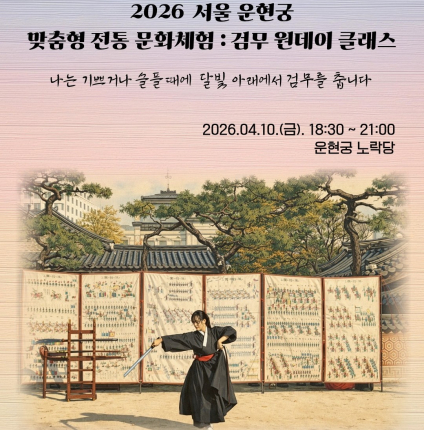 [서울=컬처GB신문] 서울 운현궁에서 전통 무예와 전통 춤을 결합한 체험형 프로그램 ‘2026 서울 운현궁 맞춤형 전통문화 체험 검무 원데이 클래스’가 4월 10일 오후 6시 30분부터 9시까지 운현궁 노락당에서 열린다.이번 프로그램은 전통문화 체험을 더 집중도 있게 운영하는 소규모 클래스 형식으로 마련됐다. 참가자는 전통 무예 전문가 박금수 박사에게 조선 검법 기본기를 익히고, 한국 무용가 이은경과 함께 검무 안무를 배워 30초 분량의 작품을 완성하는 방식으로 수업에 참여하게 된다. 세부 구성은 조선 검법 기본기 50분, 안무 수업 50분, 티타임 순으로 진행된다. 희망자 한해 영상 촬영도 지원되며, 촬영 영상은 출연자 동의를 거쳐 해당 프로그램의 SNS 홍보용으로 활용될 수 있다. 참가자에게는 검무용 목검이 수업 후 반납 조건으로 제공된다.강사진도 눈길을 끈다. 조선 검법 기본기 수업은 박금수 박사가 맡는다. 박 박사는 (사)한국무예문화보존회 대표로 활동하고 있으며, KBS 드라마 ‘추노’ 무예 지도, 경북궁 ‘첩종’ 무예 감독, 인천공항 상설 공연 ‘신 왕가의 산책’ 무예 감독 경력을 지니고 있다. 안무 수업은 한국 무용가 이은경이 함께한다. 참가비는 1인 4만 5천 원이며 정원은 10명이다. 예약은 4월 2일 오후 3시부터 네이버를 통해 가능하고, 성인만 1인 2매까지 신청할 수 있다. 취소 가능 기한은 4월 7일 오후 6시까지다. 예약 완료 뒤 계좌 입금을 거쳐 입금 확인 후 최종 확정되는 방식으로 운영된다.행사 장소인 운현궁 노락당은 서울 도심 한가운데서 궁중 공간의 분위기를 직접 체감할 수 있는 장소라는 점에서 프로그램의 현장성을 더한다. 단순 관람이 아니라 몸으로 익히고 움직이며 전통문화를 경험하는 체험형 구성이라는 점에서, 전통예술에 관심 있는 시민들에게 색다른 참여 기회가 될 것으로 보인다.문의는 운현궁 관리사무소(02-766-9090)로 하면 된다.본지는 단순한 소식 전달을 넘어, 문화 현장의 기획 구조와 실무적 운영 방식을 세밀하게 기록함으로써 지역 문화 자산의 기초 자료를 보존하고 그 가치를 확산하는 데 목적을 둡니다.