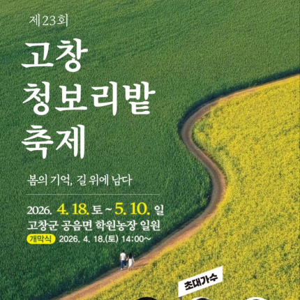 개막식은 4월 18일 오후 2시 축제장 내 특설무대에서 진행된다. 식전 공연과 보리떡 케이크 커팅식, 농악 퍼레이드가 이어지며 박군, 김미주, 농수로 등 초대 가수의 축하 공연이 마련된다. 올해는 청보리밭 한가운데를 직접 걷는 ‘보리밭 사잇길 걷기’ 체험이 처음으로 정식 운영되며, 유료 체험 시 지역 상품권 사용이 가능하다.