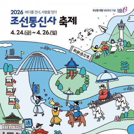 [부산=컬처GB신문] 부산항 개항 150주년을 기념하는 ‘2026 조선통신사 축제’가 오는 4월 24일부터 26일까지 3일간 북항친수공원과 조선통신사 역사관, 광복로 일원에서 열린다. 부산광역시와 부산문화재단이 주최·주관하는 이번 행사는 ‘바다를 건너, 사람을 잇다’를 주제로 과거 조선통신사의 평화적 교류 정신을 계승하는 다양한 프로그램으로 구성된다.