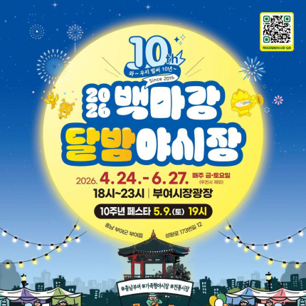2016년 시작해 올해로 10주년을 맞이한 이번 야시장은 지역 전통시장 활성화와 야간 관광 콘텐츠 확대를 위해 기획되었다. 특히 오는 5월 9일 오후 7시에는 10주년 페스타를 개최해 가수 박미경, 마마니, 미스터블루 등이 출연하는 특별 공연이 펼쳐질 예정이다.운영 기간 매주 색다른 공연 프로그램이 진행된다. 4월에는 백제의 역사와 백마강 이야기를 담은 `백제의 달빛이야기` 전통 공연이 열리며, 5월에는 재즈 라이브, 댄스 페스타, K-pop 댄스 경연대회, 청춘마이크 등이 이어진다. 6월에는 달빛 버스킹 스테이션과 군민 노래자랑인 `백마전설`, 클래식 아리아 공연 등이 관객들을 찾는다.