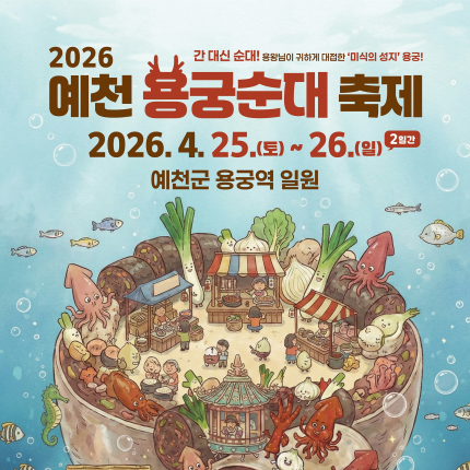 축제장에서는 퓨전 순대 음식을 맛볼 수 있는 ‘용궁 미식컵’, 돗자리를 펴고 쉬어갈 수 있는 ‘용궁 피크닉’, 원하는 재료로 직접 순대를 만들어보는 ‘순대 연구소’ 등 참여형 프로그램이 운영된다. 여기에 낚시 체험과 용궁조개 캐기 등 현장 체험 요소도 더해져 먹거리와 즐길거리를 함께 갖춘 구성으로 꾸며진다.