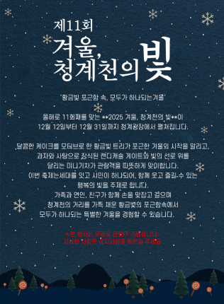 [서울=컬처GB신문] 2025년 12월 12일, 서울 청계광장이 황금빛으로 물든다. 올해로 11회를 맞은 ‘겨울, 청계천의 빛’ 축제가 ‘황금빛 포근함 속, 모두가 하나되는 겨울’을 주제로 시민을 맞는다. 행사 기간은 12월 12일부터 31일까지이며, 관람은 무료다. 행사의 중심에는 층층이 쌓인 케이크를 본뜬 ‘황금빛 케이크 트리’가 자리한다. 트리 위를 장식한 산타, 루돌프, 엘프 등의 캐릭터는 동심을 자극하며 포토존으로 손색이 없다. 트리 주변에는 별빛 조명과 황금빛 가랜드가 설치돼 방문객이 머무르며 쉴 수 있는 공간도 마련됐다. 입구를 장식하는 ‘황금빛 캔디 캐슬’은 사탕과 과자로 꾸며진 대형 조형물로, 마치 동화 속 성문을 연상케 한다. 관람객은 이곳을 지나며 포근한 겨울 감성을 체험할 수 있다. 특히 어린이들을 위한 ‘황금빛 미니기차’는 케이크 트리 주변을 따라 천천히 운행하며, 아이들과 가족에게 겨울 동화 같은 순간을 선사한다. 이번 축제는 시민 참여형 프로그램도 함께 운영된다. ‘1분의 온기, 마음을 보내요’ 영상편지 이벤트는 사랑과 감사의 메시지를 담은 1분 이내의 영상을 공모해 따뜻한 겨울의 정서를 나누는 행사다. 모든 연령이 참여할 수 있으며, 접수는 12월 30일 오후 6시까지다. 추첨을 통해 50명에게는 올리브영 2만원 쿠폰이 제공된다. 또한 ‘하모니 숏폼 페스티벌’ 영상 공모전도 진행된다. 서울시민을 대상으로 청계천의 자연과 시민이 조화를 이루는 모습을 담은 짧은 영상을 인스타그램에 업로드하는 방식으로 진행된다. 접수는 11월 30일까지며, 시상은 12월 8일 발표 예정이다. 최우수상 1명에게는 상금 100만원이 주어진다. 청계천 전역을 수놓을 황금빛 조명과 캐릭터 조형물, 포근한 조명 아래 걷는 시민들의 발걸음은 도심 속 겨울을 특별한 이야기로 채운다. 연인, 친구, 가족이 함께 걸으며 추억을 쌓기에 이보다 더 따뜻한 도심 축제는 없다. 청계광장은 이번 겨울, 세대를 잇고 시민을 하나로 잇는 빛의 공간이 될 전망이다.조상배 기자 chobs5078@naver.com