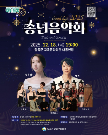 [칠곡=컬처GB신문] 칠곡군의 12월 밤이 정상급 아티스트들의 감미로운 선율로 채워진다. 경북 칠곡군은 오는 12월 18일 목요일 오후 7시, 칠곡군 교육문화회관 대공연장에서 다사다난했던 한 해를 마무리하는 ‘Good bye 2025 송년음악회’를 개최한다고 밝혔다.‘럭키 칠곡(LUCKY CHILGOK)’과 함께하는 이번 음악회는 저물어가는 2025년의 아쉬움을 달래고, 다가오는 새해의 희망을 군민들과 나누기 위해 기획되었다. 트로트부터 뮤지컬, 퓨전 클래식에 이르기까지 전 세대를 아우르는 풍성한 무대가 준비되어 있다.◇ 전유진·에녹 등 화려한 출연진, 겨울밤 수놓다 이번 공연의 하이라이트는 단연 대중의 큰 사랑을 받는 스타들의 무대다. 감성 짙은 보이스로 ‘트롯 요정’이라 불리는 전유진과 뮤지컬계의 황태자에서 트로트까지 섭렵한 에녹이 출연해 관객들의 눈과 귀를 사로잡을 예정이다.이와 함께 현악 앙상블의 진수를 보여줄 ‘디오네’, 국악과 현대 음악의 조화를 꾀하는 퓨전 국악 밴드 ‘그라나다’, 그리고 웅장한 보이스의 팝페라 그룹 ‘포르티스’가 함께 무대에 올라 음악회의 품격을 한층 높인다.◇ 군민 우선 예매 혜택 및 예매 정보 이번 송년음악회의 입장료는 전석 5,000원이며, 1인당 최대 4매까지 예매할 수 있다.칠곡군은 지역 주민들에게 문화 향유 기회를 우선 제공하기 위해 예매 기간을 분리해 운영한다. 12월 1일부터 4일까지는 칠곡군민을 대상으로 한 오프라인 우선 예매가 진행되며, 이 기간 현장 방문 시 거주 확인할 수 있는 신분증을 지참해야 한다.일반 예매(온/오프라인)는 12월 5일부터 공연 당일인 18일까지 진행된다. 예매는 티켓링크 및 칠곡홈페이지 통합 예약을 통해 가능하며, 교육문화회관을 직접 방문해서도 예매할 수 있다.칠곡군 교육문화회관 관계자는 “이번 송년음악회가 군민들에게 2025년의 아름다운 마침표가 되기를 바란다”라며 “가족, 연인, 이웃과 함께 따뜻한 음악을 나누며 행복한 연말을 보내시길 기대한다”라고 전했다.공연에 대한 자세한 문의는 칠곡군 교육문화회관(054-979-5105)으로 하면 된다.조상배 기자 chobs5078@naver.com