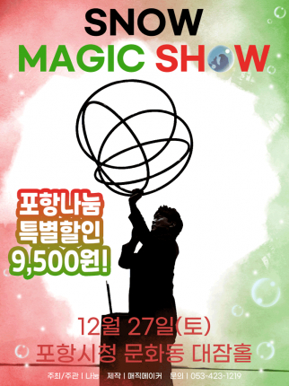 [포항=컬처GB신문] 연말을 맞아 온 가족이 함께 즐길 수 있는 겨울 문화공연 ‘스노우 매직쇼(SNOW MAGIC SHOW)’가 오는 12월 27일 토요일 포항시청 문화동 대잠홀에서 열린다. 크리스마스 시즌에 어울리는 감성적인 연출과 마술 퍼포먼스를 결합한 가족형 공연으로, 아이부터 어른까지 함께 즐길 수 있는 무대로 꾸며진다. 스노우 매직쇼는 ‘눈’을 테마로 한 스토리텔링 마술 공연이다. 단순한 기술 중심의 마술을 넘어 빛과 그림자, 음악과 움직임을 결합한 무대 연출로 관객의 상상력을 자극한다. 공연 전반에는 눈이 내리는 듯한 환상적인 분위기가 더해져, 마치 동화 속 장면을 보는 듯한 감성을 선사한다.공연은 오전 11시, 오후 2시, 오후 4시까지 총 3회 진행된다. 시간대 선택의 폭이 넓어 가족 일정에 맞춰 관람할 수 있는 점도 장점이다. 무대에서는 어린이 관객이 직접 참여하는 마술 퍼포먼스와 함께 가족 모두가 공감할 수 있는 장면들이 이어진다.이번 공연은 포항시민을 위한 특별 할인 혜택도 마련됐다. 포항나눔 채널을 추가할 경우 R석 기준 9,500원에 관람할 수 있어, 연말 가족 문화 나들이로 부담을 줄였다.제작진은 “추운 겨울, 마술을 통해 따뜻한 웃음과 추억을 전하고 싶다”며 “아이들에게는 잊지 못할 기억을, 부모에게는 함께 웃을 수 있는 시간을 선물하는 공연이 될 것”이라고 전했다.공연 정보공연명: 가족매직쇼 스노우 매직쇼일시: 2025년 12월 27일(토)공연 시간: 오전 11시 / 오후 2시 / 오후 4시(총 3회)장소: 포항시청 대잠홀관람 연령: 24개월 이상 관람 가능공연 시간: 약 60분관람료: VIP석 13,500원, R석 9,500원(포항시민 특별할인 적용 시)주최·주관: 나눔제작: 매직메이커문의: 053-423-1219조상배 기자 chobs5078@naver.com